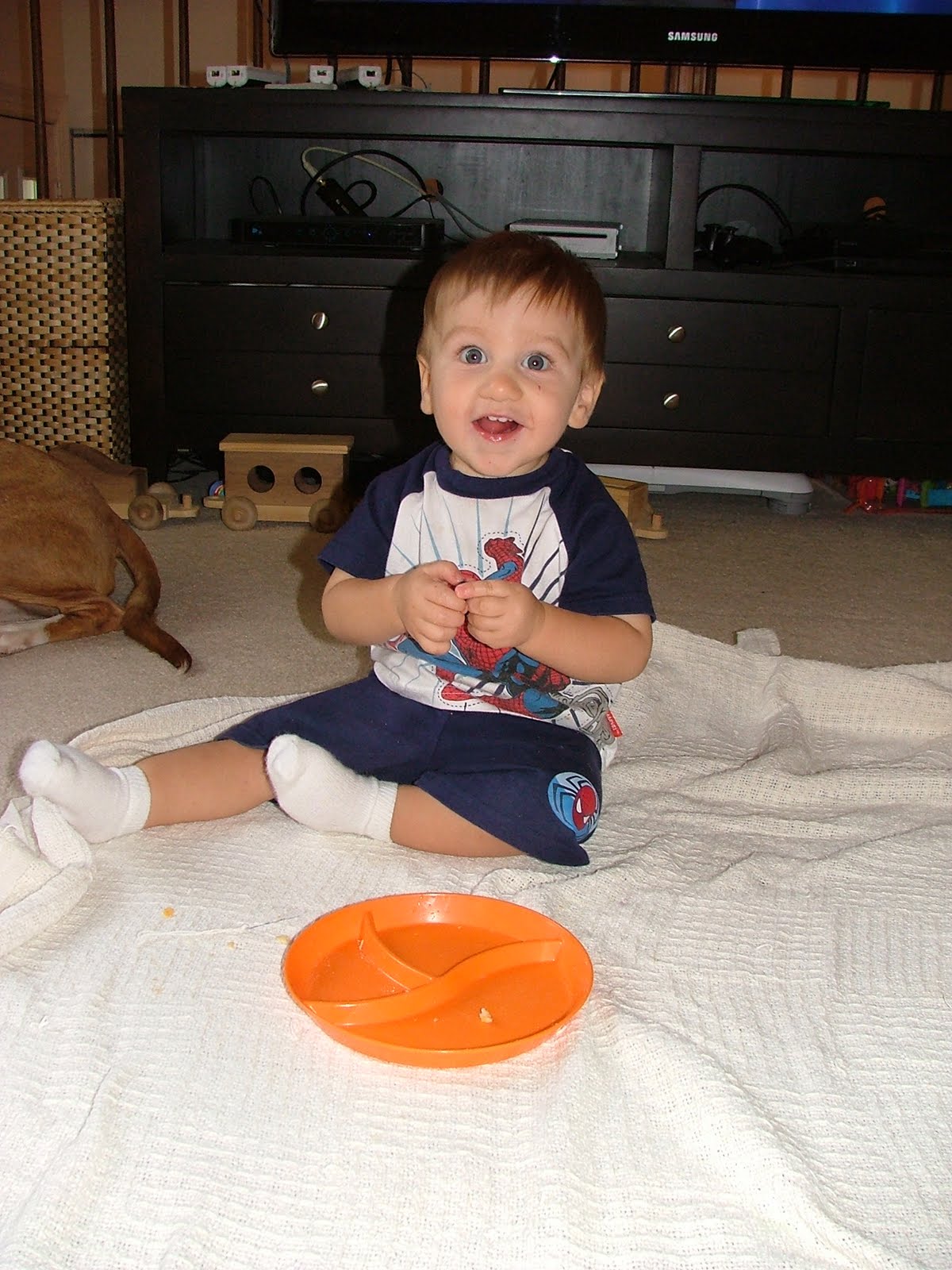 Hello all, hope everyone is enjoying this late summer/early fall weather! We have been very busy, but with all fun things. Mike bowls on Sunday nights with his dad and his sister, so that leaves us to fend for ourselves. The boys and I have dubbed it picnic dinner night, so we lay out a blanket and eat dinner in the living room (sometimes with a movie on!). Sam is eating so well now that he gets to hang out just like a big boy, he thinks he's so cool!